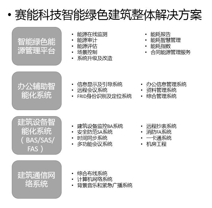 赛能科技长期从事绿色节能建筑的研究,是绿色节能建筑的一体化服务商,赛能科技采用了综合信息集成云技术、智能化系统物联网技术,以及综合节能管理技术,采用了多种节能管理手段来降低能耗、节约运营成本,实现建筑物的可持续发展;为业主提供灵活、多样的运营管理模式,为智能建筑带来更大的社会效益与增值服务。为智能建筑营造了一个人与自然和谐统一的环境,展示了一个舒适、健康、环保、节能的人性化办公的新概念,创造一个与环境相协调、能自身持续发展、具有高效率高性能的智慧型绿色建筑,为智能建筑创造一个具有弹性和可持续发展的数字建筑、绿色建筑、智慧建筑。